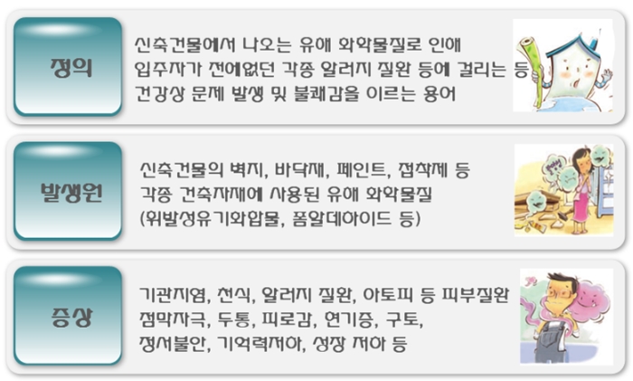 정의는 바로 신축건물에서 나오는 유해 화학물질로 인하여 입주자가 전에 없던 각종 알러지 질환등에 걸리고 유해물질로 인해 거주자들이 건강상의 문제나 불쾌감을 느끼는 현상을 말합니다.