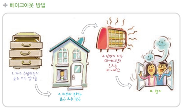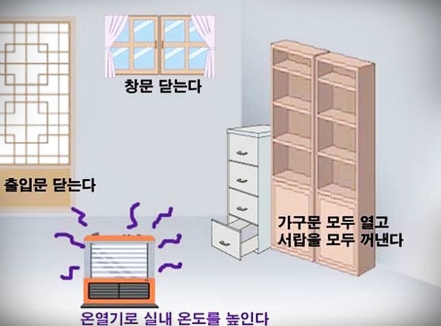 이는 환경부 뿐만 아니라 전 세계적으로 가장 공인된 방식으로 알려져 있습니다. 단순 환기보다 더 효과적이고 공인된 방법 베이크 아웃인데,, 위에 사진처럼 건물을 뜨겁게 달궈 오염물질을 배출 시키는 방법 으로 , 밀폐된 상태에서 실내 온도를 30~40도까지 올려 8시간 유지한 뒤 2시간 이상 환기하면 됩니다.
