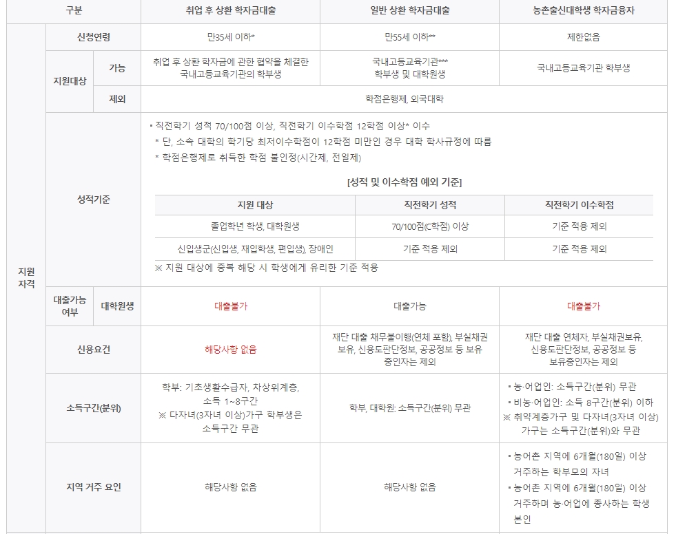 신청연력,대상,성적기준,대출가능여뷰,신용요건 소득구간을 지역거주요인등