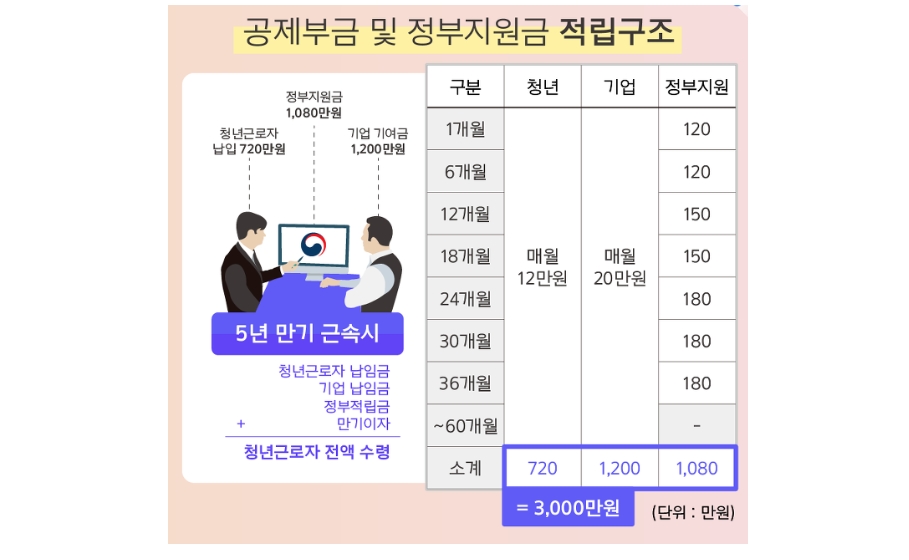 청년 본인이 3년간 600만원(매월 16만5천원)을 적립하면(정부 1800만원)과 기업 (600만원)이 공동적립 됩니다.