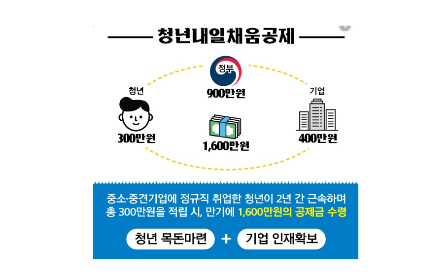 청년내일채움공제는 중소,중견기업에 정규직으로 취업한 청년들의 장기근속을 위하여 고용노동부와 중소벤처기업부가 공동으로 운영하는 사업으로 청년,기업,정부가 공동으로 공제금을 적림하여 2년 또는 3년간 근속한 청년에게 성과보상금 형태로 만기공제금을 지급하는 제도 입니다. 2년형의경우 1600만원 3년형의경우 3000만원 입니다.