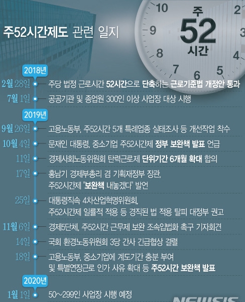 정부는 2020년 1월 1일부터 주 52시간 근무제가 적용되는 50-299인 중소 사업장에 대해 충분한 계도기간을 두고 특별 근로 연장도 최대한 확대한다고 하는 소식이 있습니다.