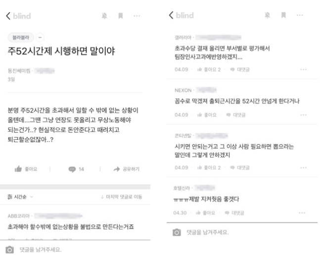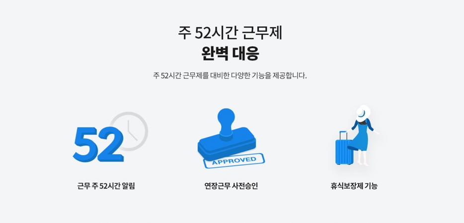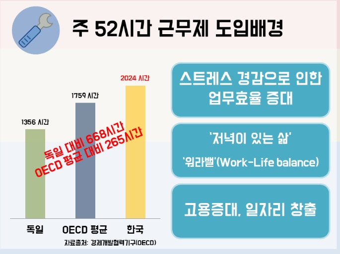 2018년 주 법정 근로시간을 52시간 단축하는 근로기준법이 통과되고 300인이상 사업장 대상으로 시행하였습니다.