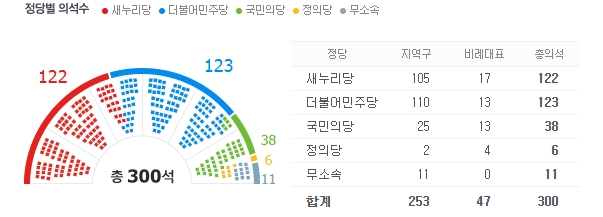 비례대표 포함 총 300석의 국회의석을 볼수 있습니다.
