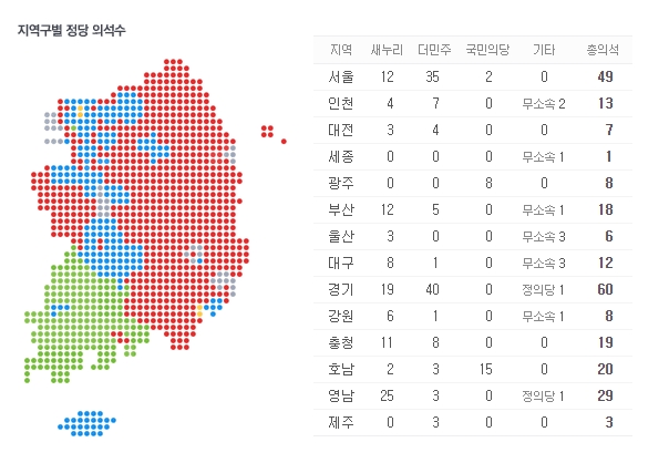 지역별 정당 의석수를 볼 수 있습니다.