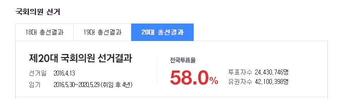 2016년에 치뤄졌던 20대 총선을 살표보도록 하겠습니다.
