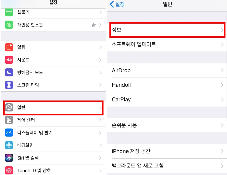 설정 > 일반 >정보 > 모델 일련번호로 확인이 가능합니다.