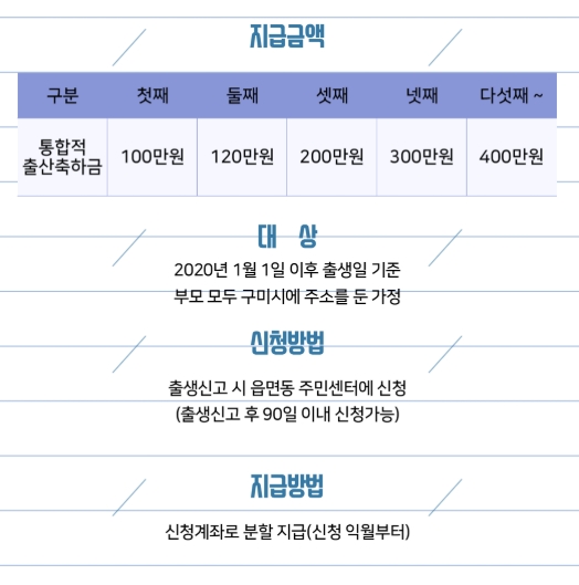 2020년 1월 이후 출생일 기준하여 구미시 주소를 둔 부부가 출산시 받을 수 있는 혜택입니다.