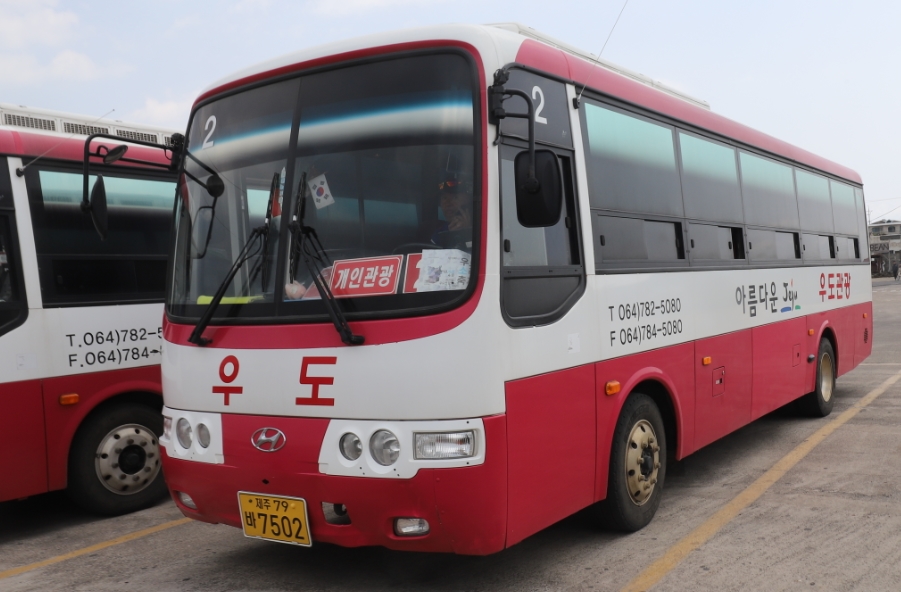 앞에 보이는 버스를 타고 우도로 여행을 시작하겠습니다.