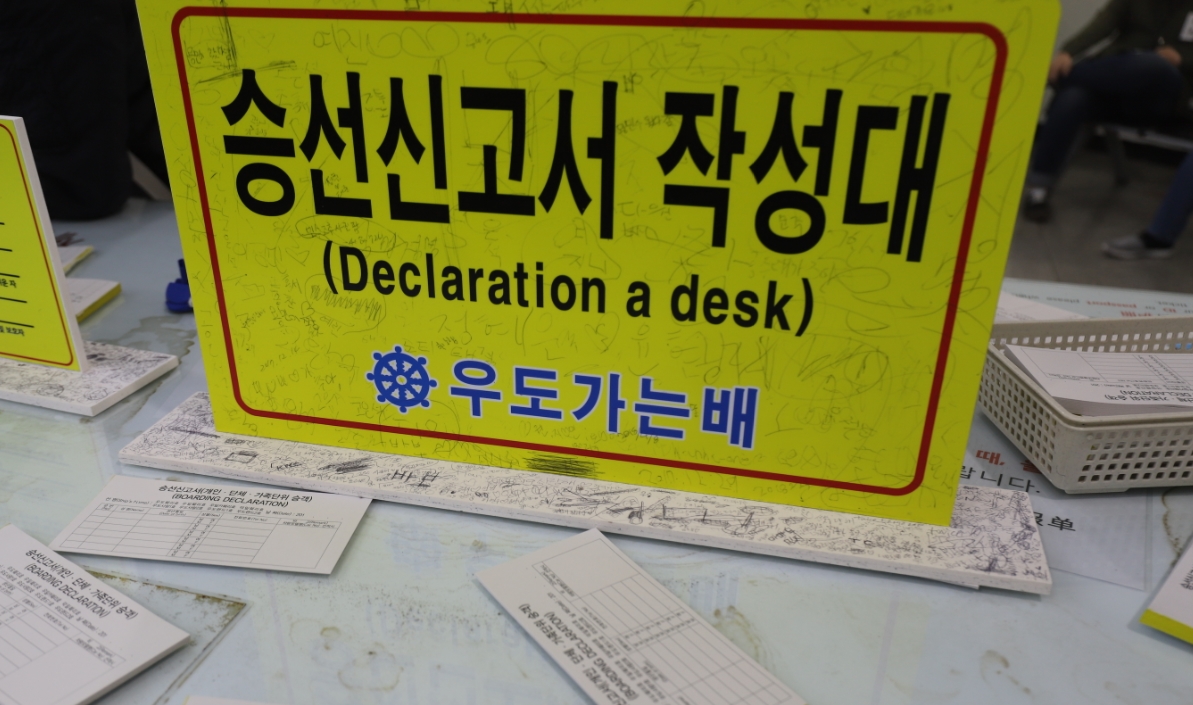 따로 마련되어 있기 때문에 작성하시면 됩니다. 승선신고서는 1장당 최대 6명까지 작성 가능합니다. 한 명씩 따로 작성할 필요 없이 혼자서 개인정보를 받으셔서 적으시면 되겠습니다 간단하죠 이렇게 작성 후 매표소에 줄을 서시면 됩니다.