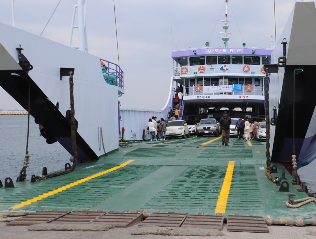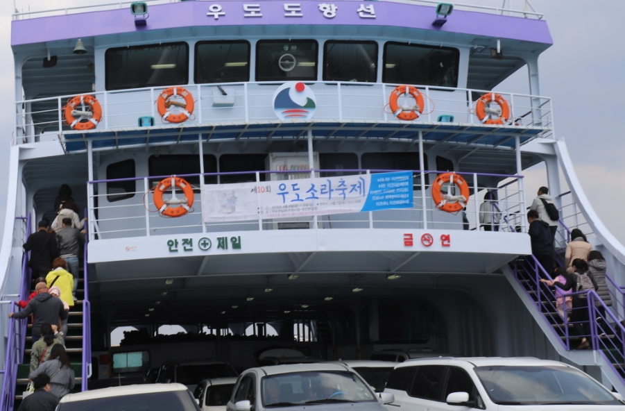 표를 끊고 나면 밖으로 사람들을 따라 나가면 우도 도항선에 올라탈 수 있습니다 승객의 안전을 위해여 제일 먼저 자동차를 전부 실은 후 사람들이 탈 수 있습니다. 1층은 자동차 전용 2층과 3층은 승객 전용으로 계단을 타고 올라가시면 됩니다.