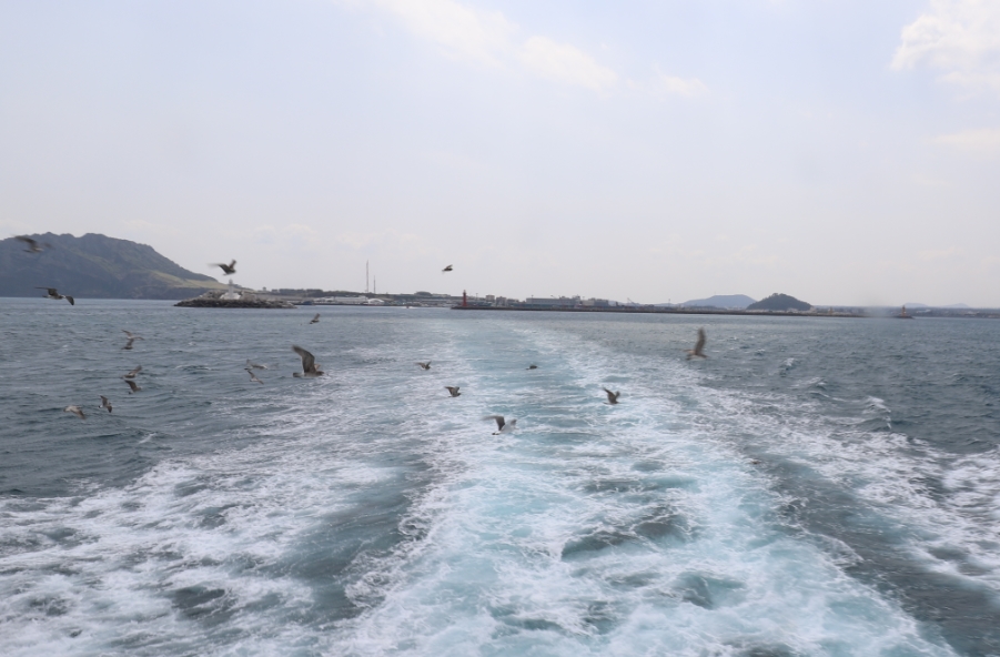 우도로 향해 드디어 출발하였습니다.!! 배가 출발하니 우도 맛집인 것처럼 갈매기들이 배 주위를 맴돌고 있더라고요! ㅋㅋ TV에서 보면 새우깡이나 과자를 던져주면 와서 받아먹는데! 과자를 챙겨 온 사람들이 많이 계시더라고요!