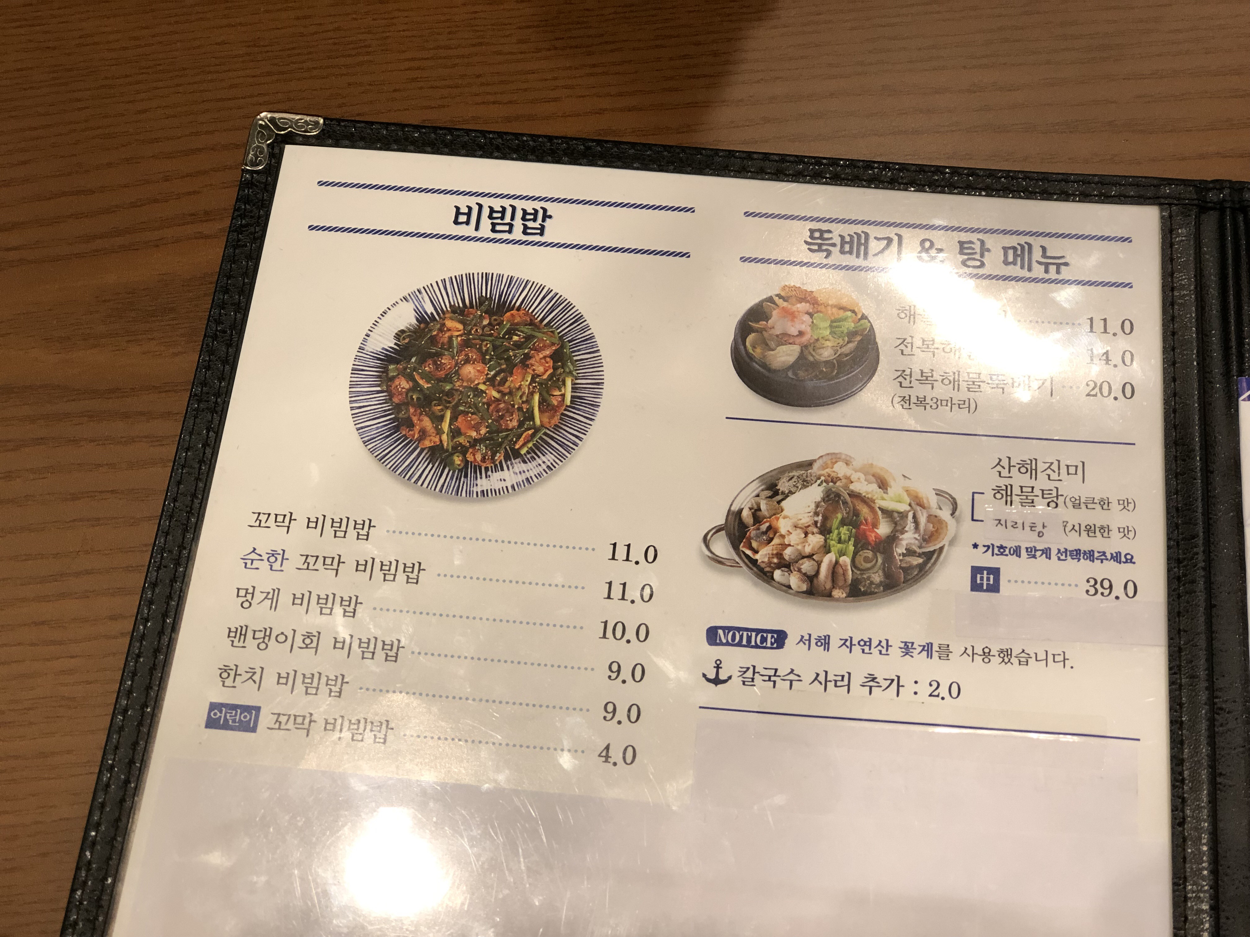 연안식당은 비빔밥으로 유명한데 제일 많이 먹는 비빔밥이 당연 꼬막비빔밥이고 매운걸 못먹는 분들은 순한 꼬막비빔밥 그리고 멍게 밴댕이회 한치 등등이 준비 되어있었어요