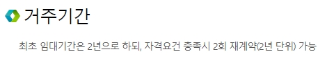 거주지간은 최초 임대기간 2년으로 하고 있고 , 자격이 충족 될경우 2회 재계약 2년단위 최대 6년까지 살수있습니다.