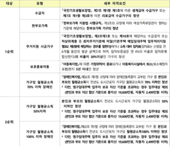2순위 : 전년도 도시 근로자 월평균 소득의 50프로 이하인 가구입니다. 월수득은 100프로 이하고 장애인 가구의 청년이어야 합니다.