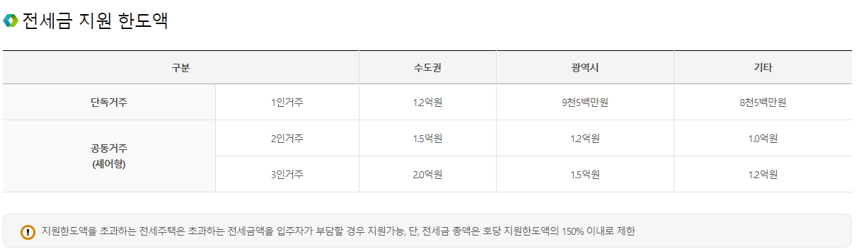 LH청년전세임대주택의 전세 지원금 한도액은 위표와 같습니다. 전국에 수도권,광역시,기타,그리고 단독거주,공동거주로 구분되어지는데요 단독 1인거주시 최저 8천5백만원에서~ 1억2천만원까지 지원금을 받을 수 있고 공동거주 (셰어) 2인이상일경우 최저 1억에서 최대 2억원까지 지원금을 받을 수있습니다. 위 표를 확인하시면 편하실거에요 ^^