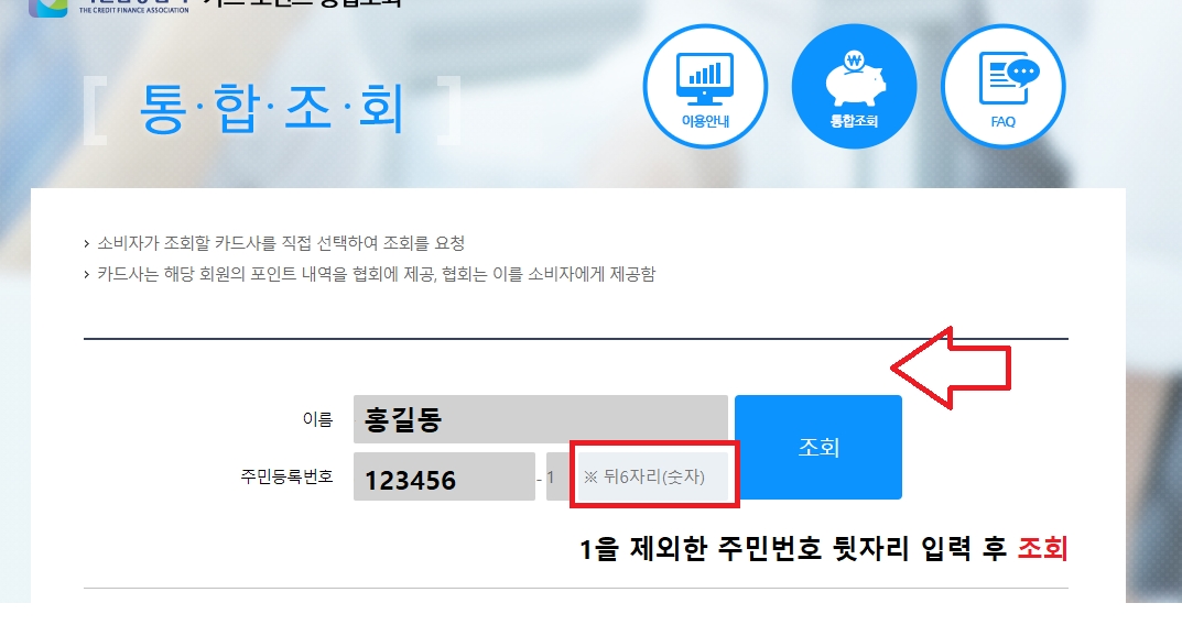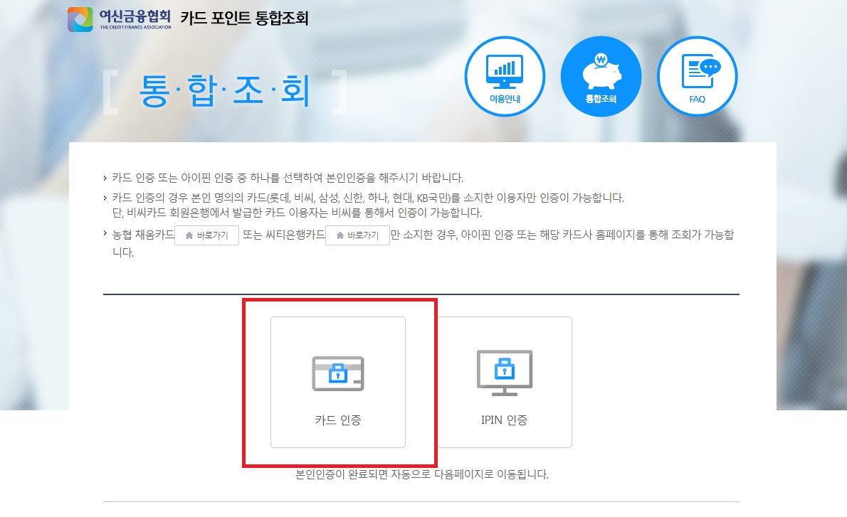 검색사이트에 카드포인트 통합조회를 하시면 여신금융협회 카드포인트 통합조회 사이트로 이동할 수 있습니다. 이곳에서 내가 사용헀던,사용하는카드의 포인트를 조회 할 수 있습니다.