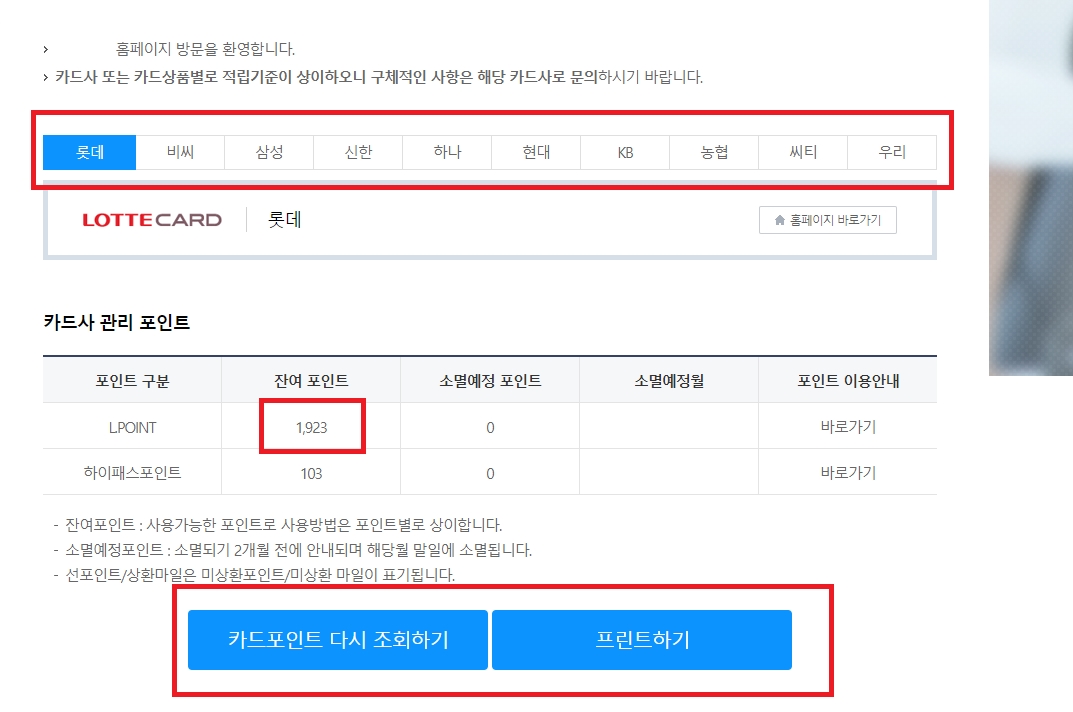 조회가 마무리되면 위에 사진처럼 잔여포인트 를 조회 할 수 있습니다. 카드포인트 꼭 챙기시길 바랍니다 ^^