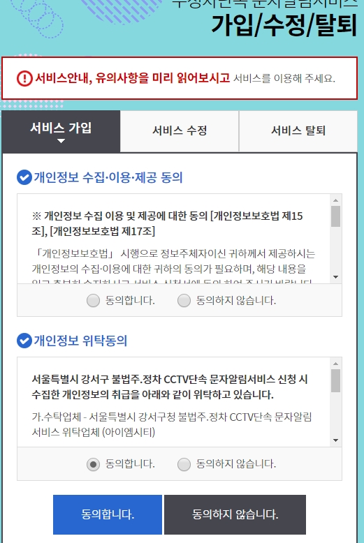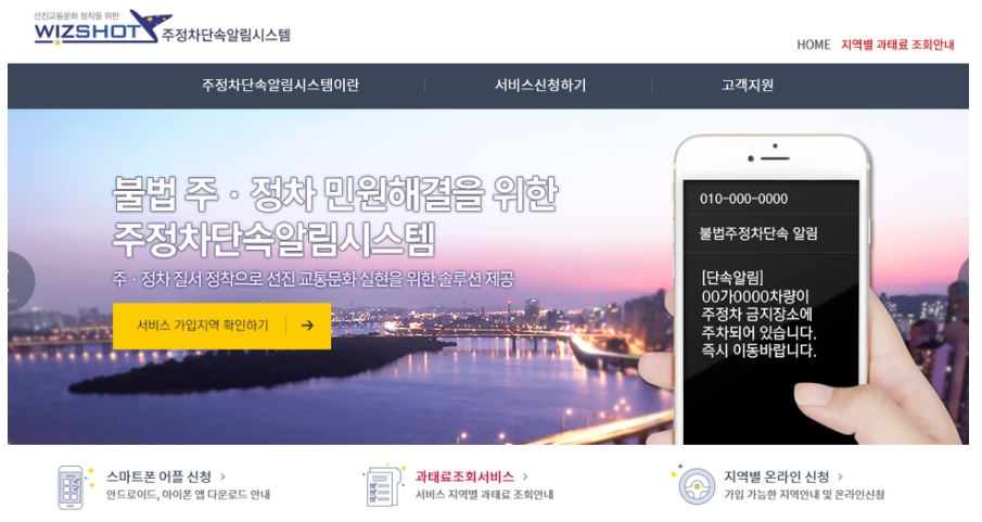 일단 주차단속 알림서비스를 신청하기 위해선 상단에 표시되어있는 사이트로 접속을 해야합니다. 동일장소에 위반 사례를 방지하기 위한 목적으로 1회차 경고로 문자로 알려주고 바로 차량을 이동시 과태료가 발생하지 않습니다. 만약 5분이내에 다시 그자리에 주차를 한다면 과태료 대상이되는 것입니다.