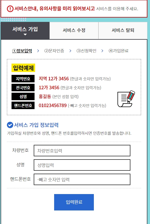 마찬가지로 서비스 신규신청을 해야한느데 내가사는동네에서 차량번호,성명,휴대번호,를 입력하면 간단하게 신청을 할 수 있습니다. 의외로 쉽죠??