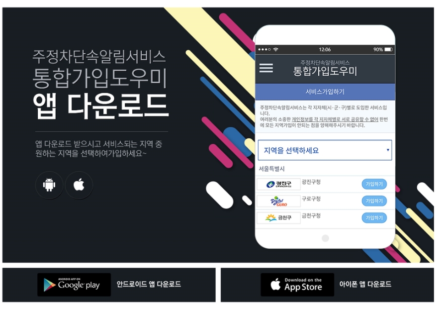 주차단속 알림서비스는 스마트폰 어플로도 신청이 가능합니다. 안드로이드나 , 아이폰의 경우 검색을 주정차 단속 알림서비스로 검색하시면 어플을 다운 받을 수 있습니다.