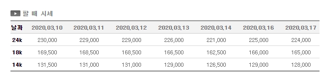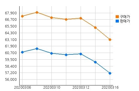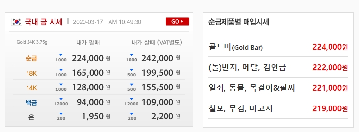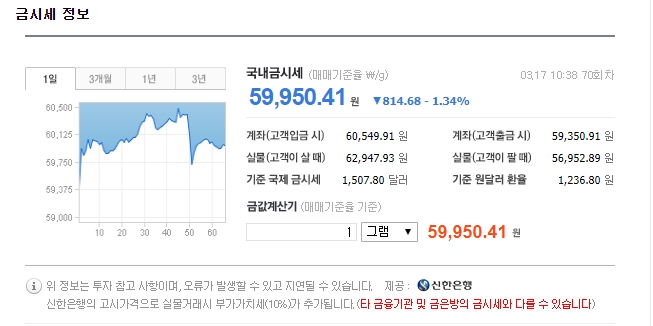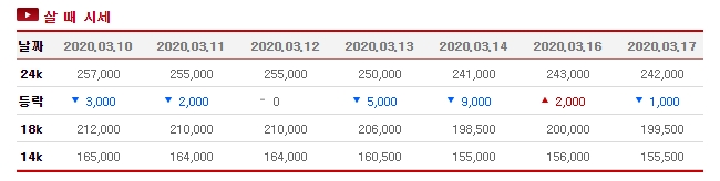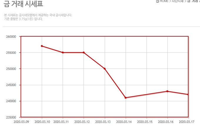 오늘 기준 국내 금시세를 보면 1그램당 가격이 전일 대비 하락한 모습을 보여주고 있습니다 그리고 3월 6일부터 3월 17까지 금거래 그래프를 보면 금값은 계속 하락하고 있는 모습을 보여주고 있습니다. 주식과다르게 크게 하락하고 상승하는 모습을 볼수없습니다.
