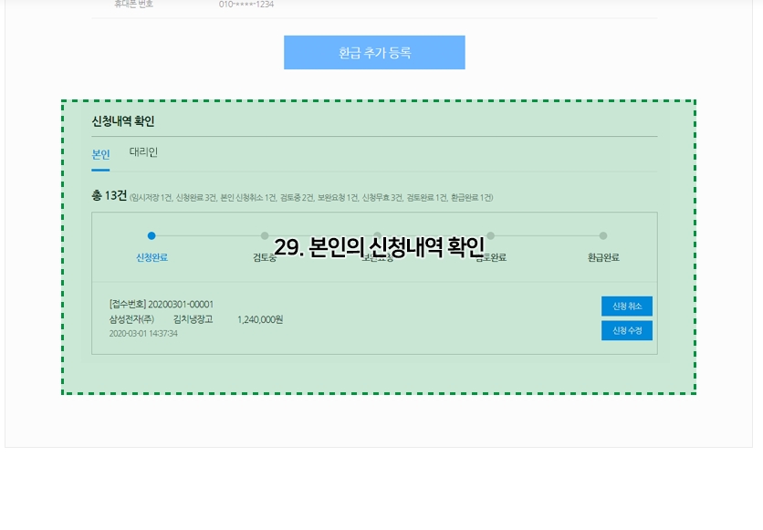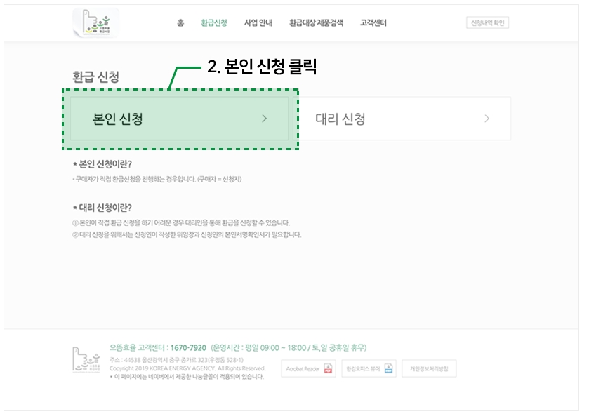 온라인 환급시스템(https://revate.energy.or.kr)에 접속을 한 후 4단계 절차로 신청을 할수 있습니다.