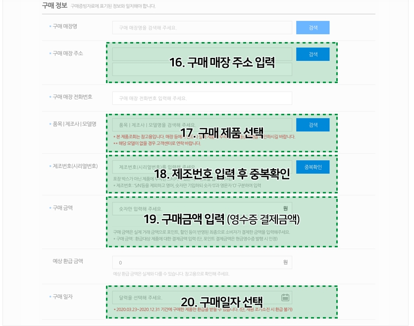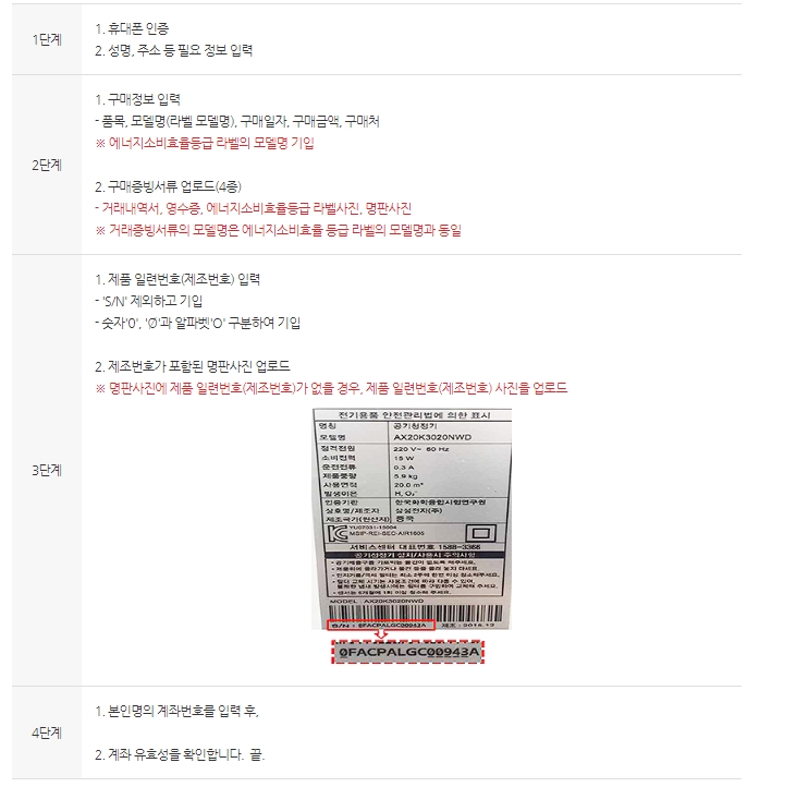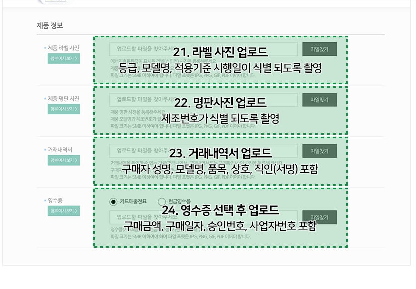 2단계 : 구매정보 입력 , 품목 , 모델명 , 구매일자 , 구매금액 , 구매처 입력,증빙서류 업로드(거래내역서,영수증,에너지소비효율등급라벨사진,명판사진)