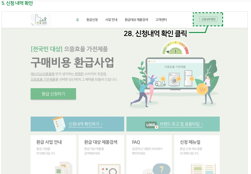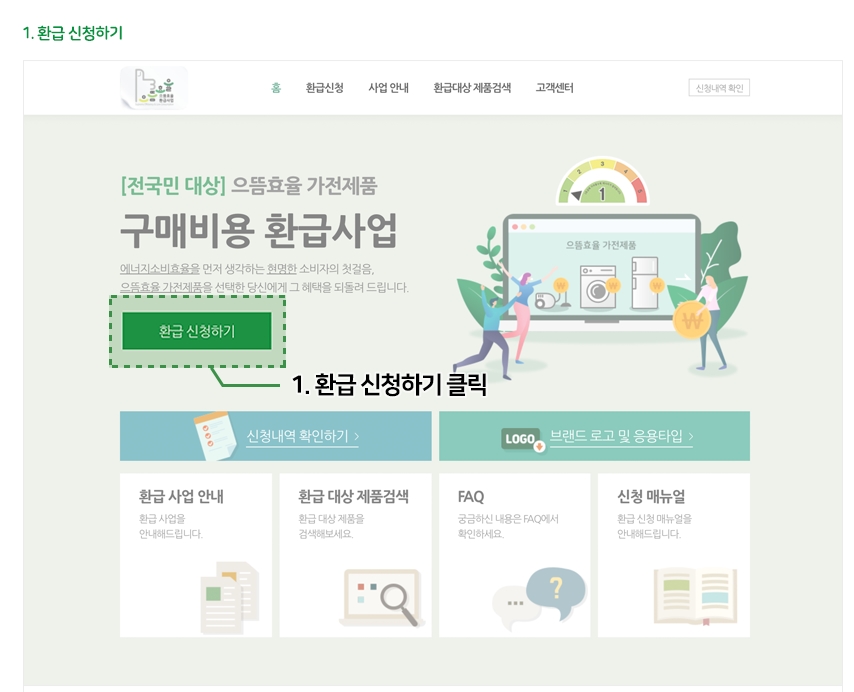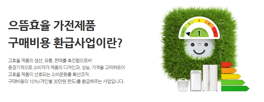 [전국민 대상] 으뜸효율 가전제품 구매비용 환급사업 에너지소비효율을 먼저 생각하는 현명한 소비자의 첫걸음, 으뜸효율 가전제품을 선택한 당신에게 그 혜택을 되돌려 드립니다. 환급 신청하기