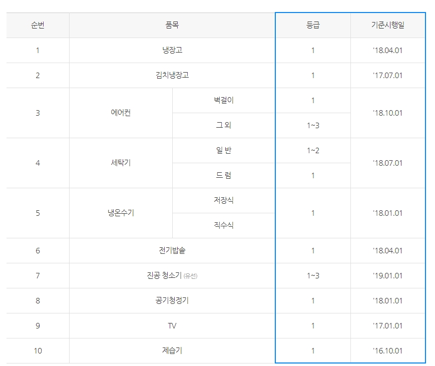 위에 보시면 1번부터 10번까지 냉장고,김치냉장고,에어컨,세탁기,냉온수기,전기밥솥,진공청소기,공기청정기,TV,제습기등 10개의 항목이 있습니다. 단 1등급이라고 표시되어있는 라벨이 있어야 환급이 가능합니다.