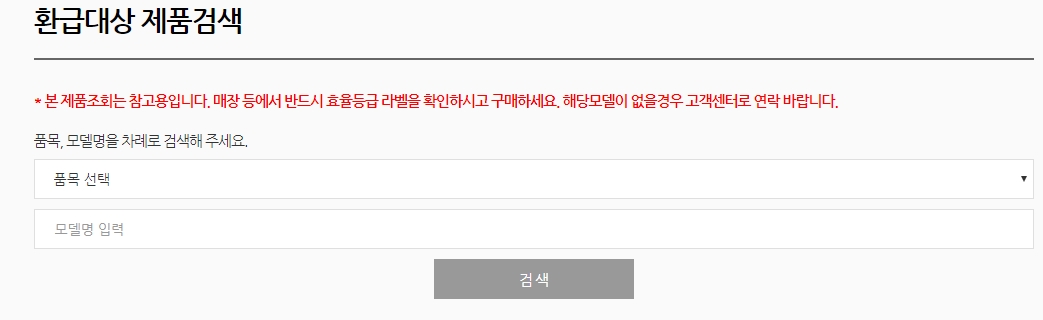 옆에 링크로 이동후 내가 사용하는 제품의 모델명을 입력하면 환급 대상 제품인지 조회가 가능합니다. 모델명을 입력후 검색을 하도록 하겠습니다.