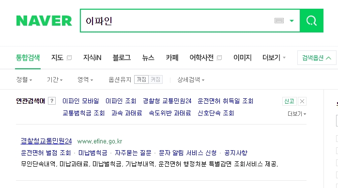인터넷 검색창에 이파일을 검색하도록 하겠습니다. 네이버,다음,빙,등 어느곳이든 검색이 가능합니다. 이파인에서는 연관검색어를 보시다시피 과속과태료조회,속도위반 , 신호단속, 운전면허 취득일 조회등 여러가지 조회 서비스를 할 수 있는 곳입니다.