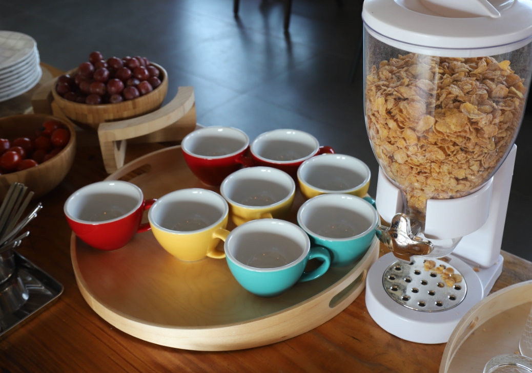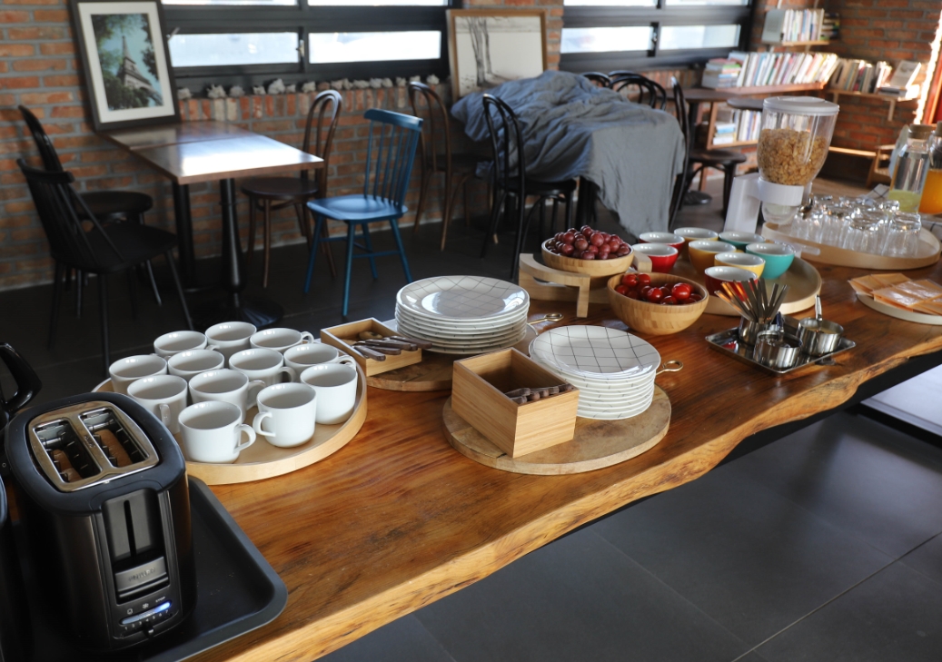 제주도에 오면 하루도 허투루 쓰기 싫어서 아침 일찍 일어나 준비하였습니다. 다행히 마음스테이에서는 간단하게 식사를 할 수 있게끔 조식이 준비되어있었어요!! 1층은 카페로 이뤄져 있어서 게스트하우스 오신 손님들이 밤에는 맥주나 외부 음식을 먹을 수 있고 책을 읽는 공간으로 사용을 한다고 하더라고요! 일단 너무 깔끔하고 분위기 좋아서 1시간 동안이나 혼자 조식 먹으며 딴짓했던 것 같아요