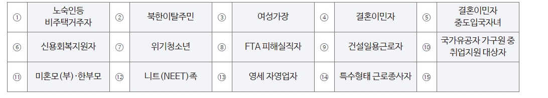 | 청년 | 비경활 | 저소득층 | 특정계층 | |||||