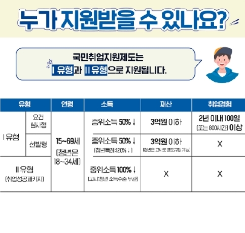 | 요건심사형 | 15-69세 구직자중 가구단위가 중위 50%이하, 재산3억이하,취업경험(최근 2년 이내 100일 또는 800시간 이상)일경우 | 저소득층 | 15~69세 중위소득 60%이하 특정계층,월 250만원 미만의 특수형태종사자,영세자영업자 |