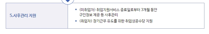 국민취업지원제도 참여자는 1년간 취업지원서비스를 받을 수 있다 최대 6개월 범위 연장가능 고용센터는 취업지원 종료후,취업하지 못할경우 취업정보 제공,구직활동 지원등 사후관리도 제공한다 참여자가 취업할 경우에는 계속 일할 수 있도록 취업성공 수당(최대 150만원)별도 지원 |