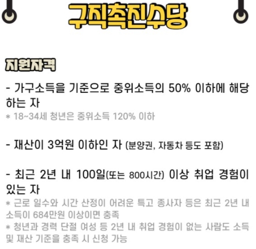 취업을 원하는 청년과 장기실업자,경력단절자(여성),저소득 구직희망자,특수형태근로종사,취업취약계층으로 인정되는 분들께서는 국민취업지원제도를 통해 구직촉진수당을 지원 받을 수 있습니다.