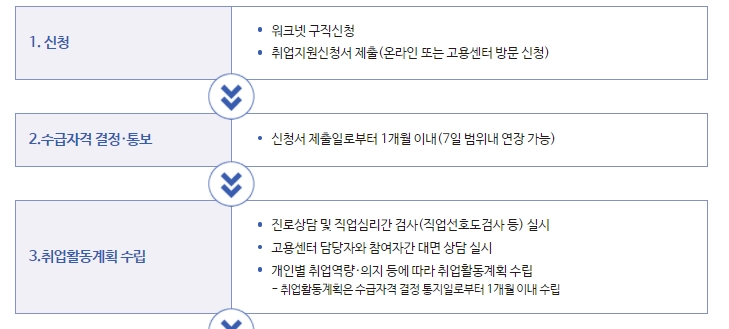 1. 신청 > 수급자격결정통보>취업활동수립>수당지급>구직활동이행> 수당지급> 사후지원