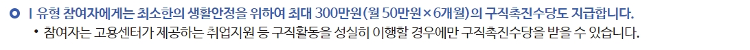 유형 1 참여자에게는 최소한의 생활비 , 안정자금을 최대 300만원(월50만원 6개월) 구족 촉진수당 지급됩니다.