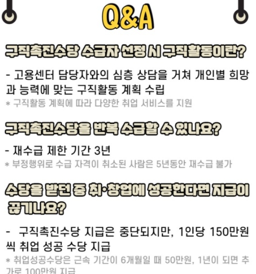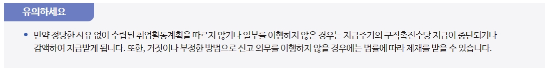 단 고용센터에서 제공하는 취업지원 구직활동을 이행해야 구직 촉진수당을 받을 수 있습니다.