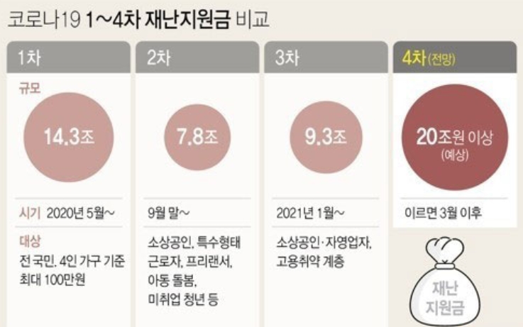현재까지 1차부터 3차까지 재난지원금이 지급 되었는데요 4차 재난지원금의경우 1차~3차보다 많은 20조원 이상(예상) 규모로 지급이 된다고 합니다. 이르면 3월 이후에 될 가능성이 많겠습니다. 내가 얼마나 받을 수 있는지 해당조건이 되는지 한번 알아 보도록 하겠습니다.