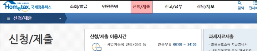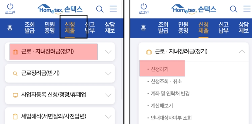 홈텍스 로그인 > 신청/제출 > 근로/자녀장려금신청 > 주민번호,인증번호 입력 > 연락처 계좌번호 입력 > 신청완료