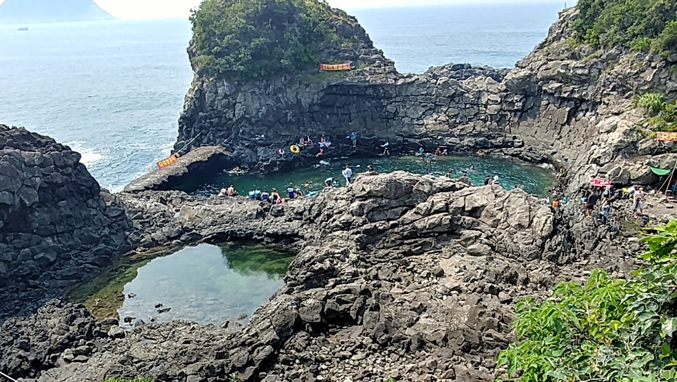 멀리서 찍은 에매랄드 빛의 황우지 해안입니다.