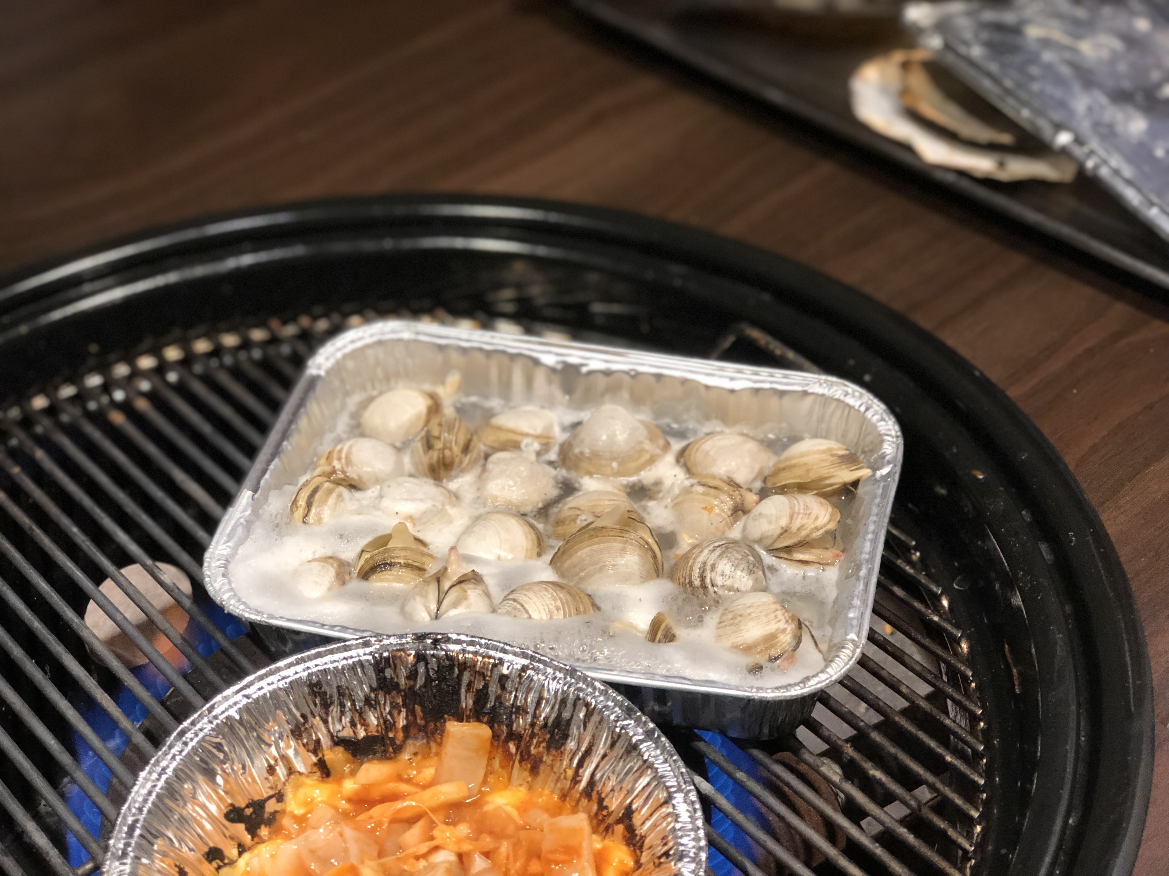 늦은 저녁이라 9시쯤 방문한것 같아요 !! 일요일저녁 소주한잔에 하루를 마무리 하는 분들이 계셨어요! 그리고 이 라인은 고기와 조개를 같이 구워 먹는 자리라 반대쪽에 고기 구워먹는 손님들이 조금 계셨더라구요