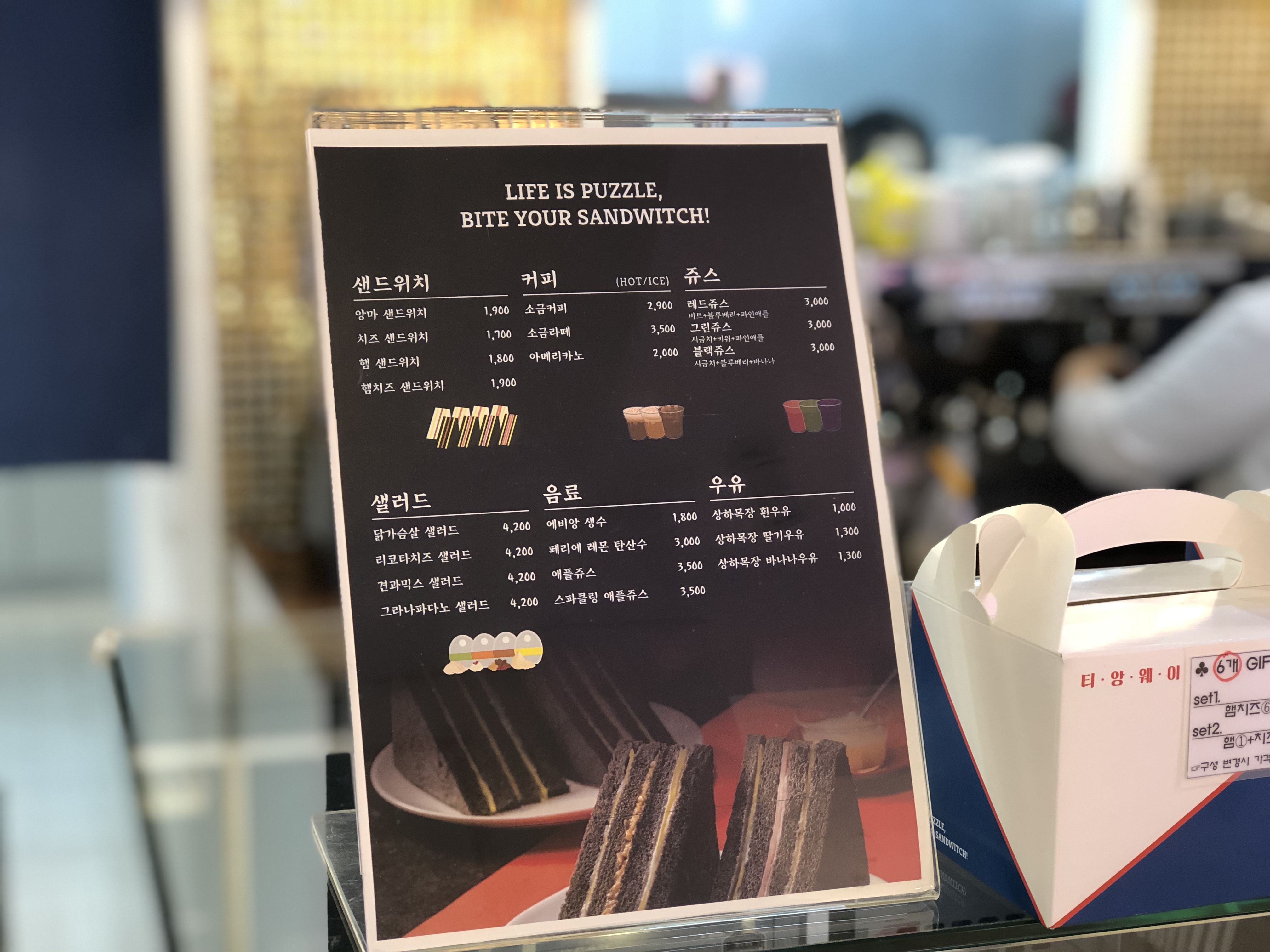 샌드위치와커피,쥬스,샐러드등 여러가지 메뉴가 있었습니다. 요즘 다이어트를 하고 있어서 샐러드가 절실하게 필요 했던 터라 샌드위치도 두가지 종류로 포장해 달라고 하였습니다. 가경느 4200원정도 저렴한 가격? 이었던것 같아요 직접 해먹기 귀찮은 사람으로써 정말 편하죠