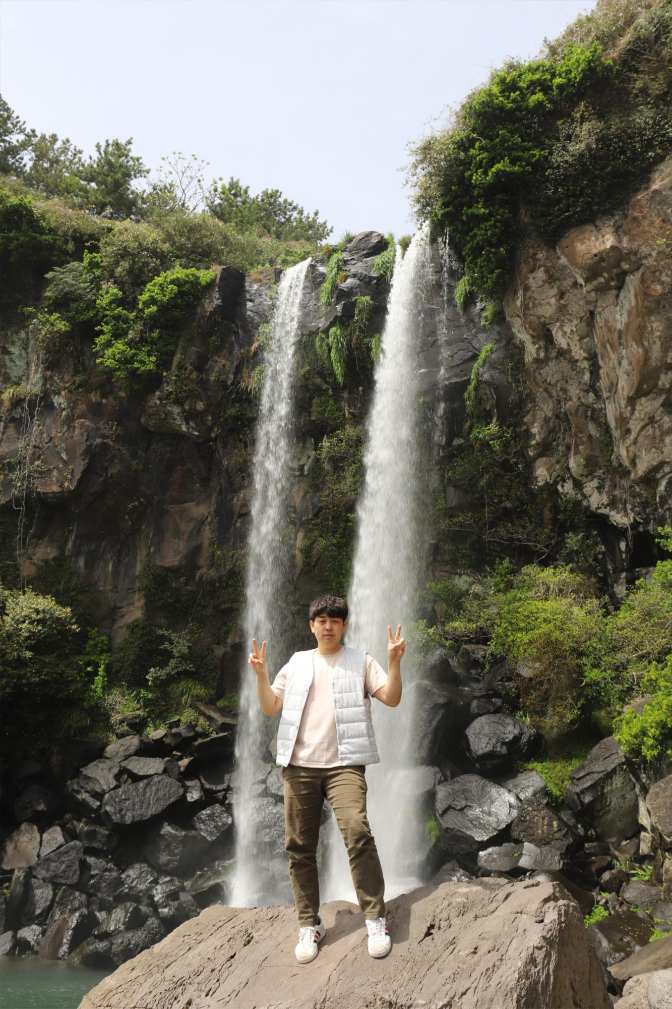 정방폭포는 찍는사진마다 인생사진입니다. 앞에 보이는 돌위에서 정방폭포 배경으로 사진을 찍어도 정말 멋있게 나옵니다 폭포 물을 먹는 사진을 찍어 보려고 하였지만 실패로 끝나고 말았다는 ㅠㅠㅠ