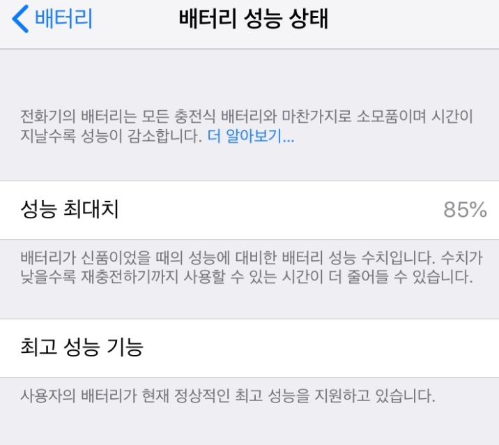 아이폰경우 설정에 들어가서 배터리 성능을 확인해서