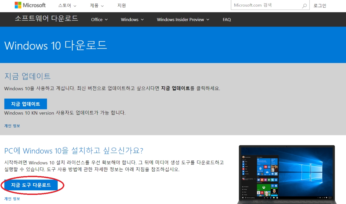 위 사진처럼 윈도우 다운로드로 이동하면 지금도구 다운로드를 눌러 클릭 하도록 하겠습니다.