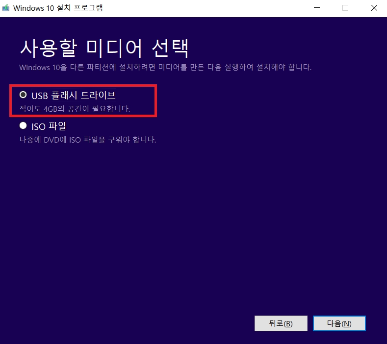 USB에 4GB의 공간이 필요하는데 보통 16gb 정도의 메모리를 사용하시면 됩니다.