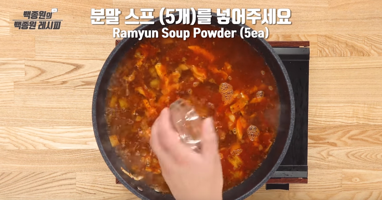 분말스프를 넣어 주고 건더기 스프도 넣어주도록 하겠습니다.
